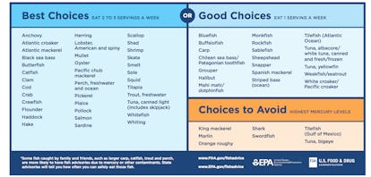 nogle fisk, der er populære i kogt og rå sushi, indeholder høje niveauer af methyl-kviksølv, hvilket er usikkert for et udviklende foster. Af denne grund er det vigtigt at være opmærksom på, hvor meget du spiser, og hvilken fisk der tilberedes. Ifølge Food and Drug Administration (FDA) er en portion fisk cirka 4 ounces eller størrelsen på din håndflade. Der er masser af fiskemuligheder på de fleste restauranter, men FDA har kondenseret oplysningerne til en infografik.
