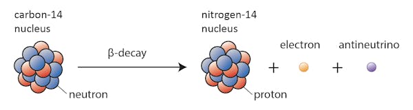 tällöin yksi hiili-14: n neutroneista muuttuu protoniksi, jolloin muodostuu typpi-14. Tämän beetahajoamisena tunnetun prosessin aikana ydin säteilee elektronin ja antineutriinin muodossa.