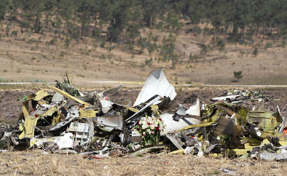 EJERE, Etiopia – 13 marca: bukiet kwiatów jest umieszczony przed kupą gruzu na miejscu … Katastrofa lotu Ethiopian Airlines 302 wydarzyła się 13 marca 2019 roku w Ejere w Etiopii. Wszystkie 157 pasażerów i załogi zginęło po tym, jak samolot Ethiopian Airlines Boeing 737 Max 8 spadł sześć minut po starcie z lotniska Bole. (Fot. Jemal Hrabina/Getty Images)
