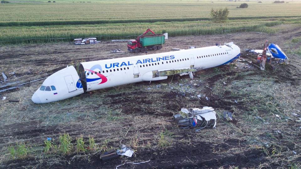 Obwód moskiewski, Rosja – sierpień 23, 2019: Widok z lotu ptaka na samolot Airbus A321 linii Ural Airlines … samolot po awaryjnym lądowaniu na polu kukurydzy w pobliżu międzynarodowego lotniska Żukowski 15 sierpnia, jego przedni korpus został zdemontowany; lewe skrzydło i lewy silnik zostały już zdemontowane. Marina Lystseva/TASS (fot. Marina Lystseva\TASS via Getty Images)